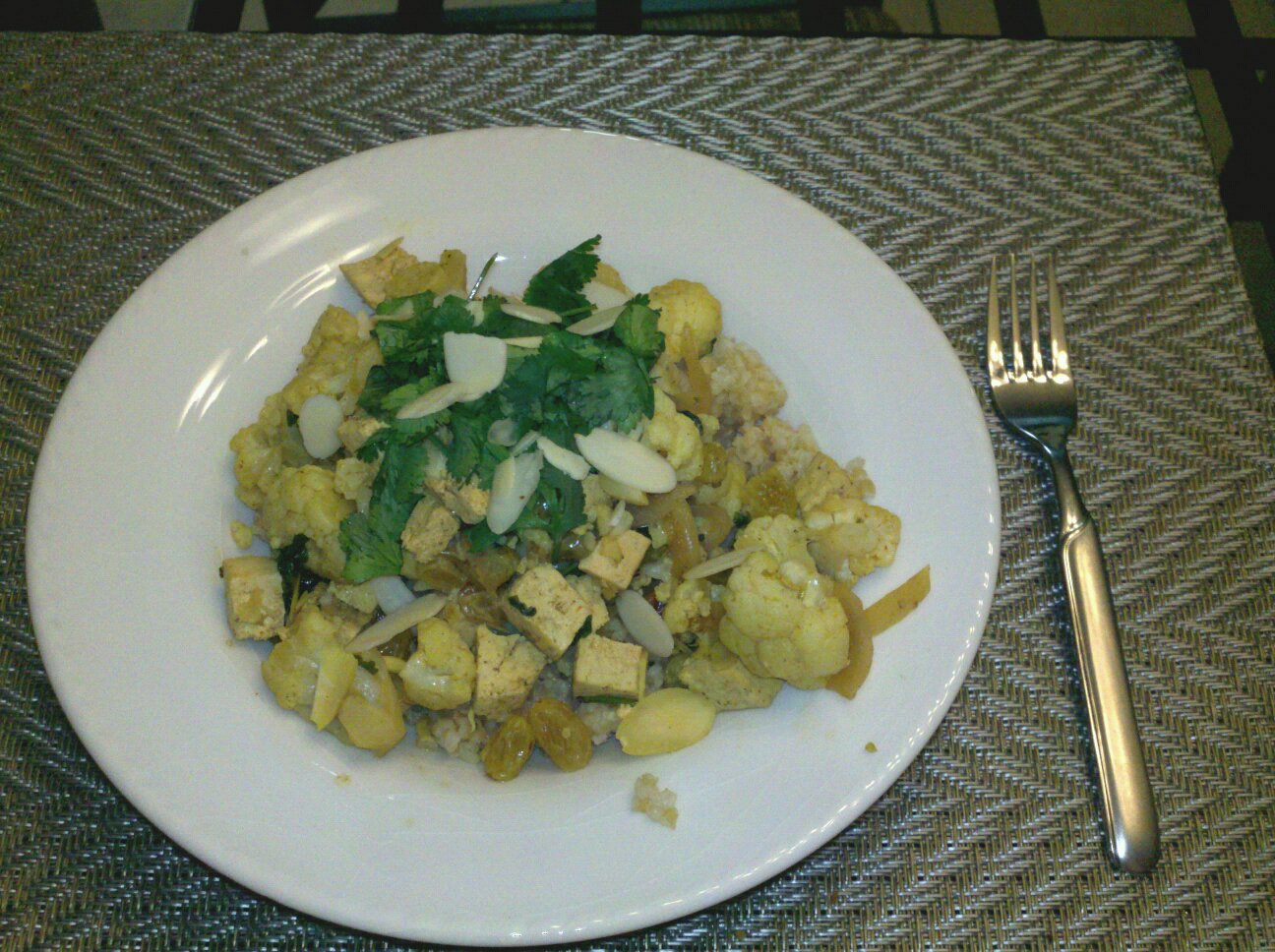 - Heat oil in a large skillet over medium-high heat. Add onion and garlic and cook until starting to brown, about three minutes. Stir in cauliflower, tofu, raisins, spices, salt, pepper, vegetable broth and bay leaf.