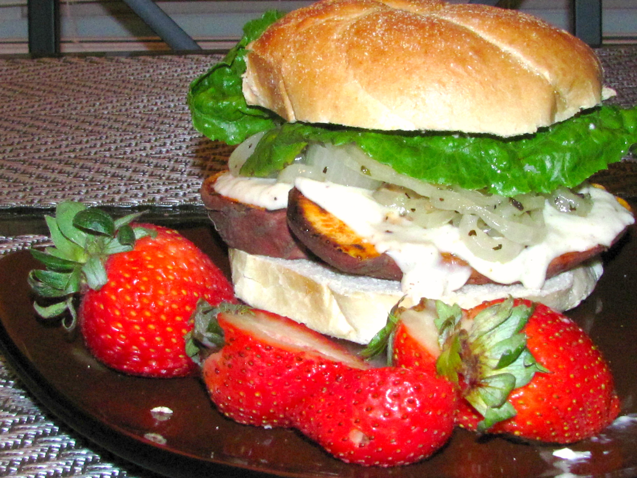 Like burgers but tired of the same old veggie patty? Switch it up by grilling humble sweet potato slices! This is an interesting flavor combination, nonetheless, but my husband had two of these tonight! Sorry to be so late on posting a 4th of July themed recipe, but I’ve been M.I.A. due to some personal reasons. But now I’m back and ready to tantalize your taste buds!