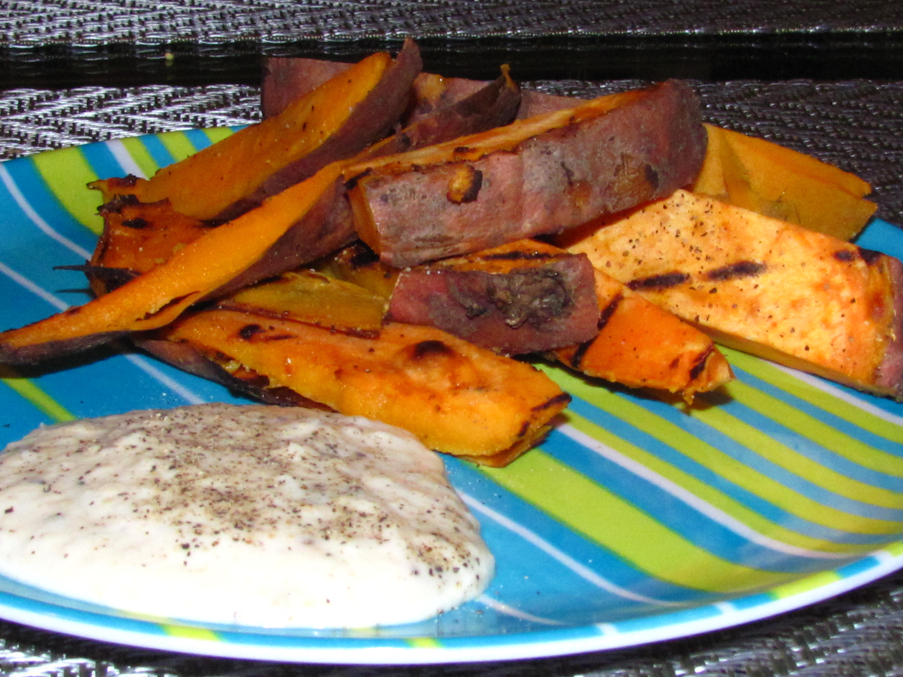Once we had used all the grilled potato slices, I sliced them up like sweet potato fries (I know, I caved and had to recreate the delicious New Jersey fries I had at the bar as best as I could) with a side of horsey sauce.