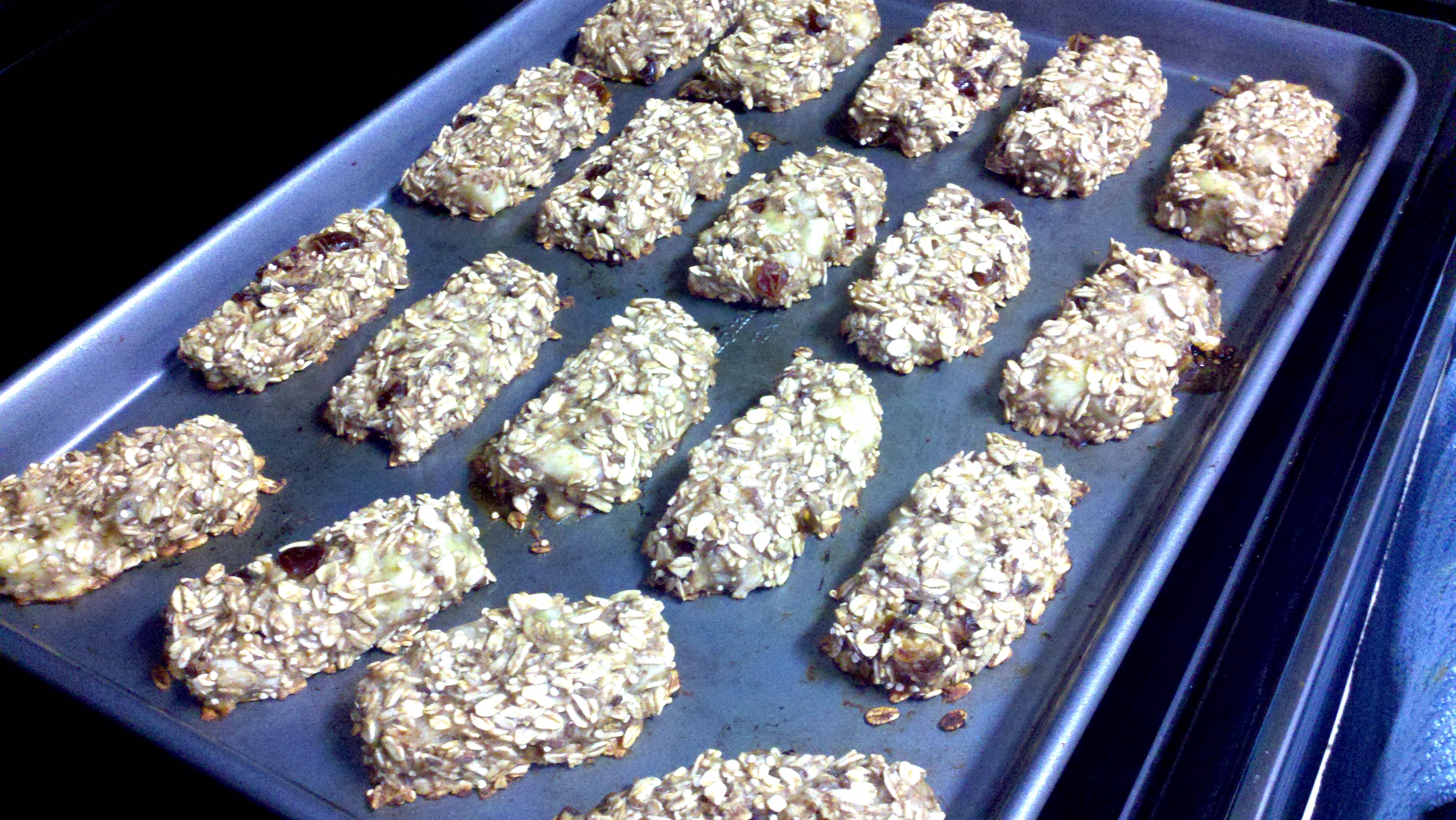 Preheat oven to 350. Peel your bananas and place in a large mixing bowl. Mash with the potato masher and add the rest of the ingredients. Mix well. On a lightly oiled (or non-stick sprayed) cookie sheet, shape and arrange the bars as you wish. Bake for 20 minutes at 350 or until slightly browned.