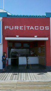 I recently visited Ocean City NJ with my husband (he is from the area) for some family business and we decided to take a much-needed, decompressing trip down to the Jersey Shore. I love the sights, sounds, smells and best of all, the food…but being much more health conscious these days, shore food isn’t quite on my everyday healthy menu. I was stranded in a sea of delicious cheesy topped pizzas (yeah, not so great when you’re lactose intolerant!) and fountains of fabulous fried foods until I, to my surprise, stumbled upon the miraculous little piece of paradise: Pure Tacos. At first I was a little skeptical…”hmm, tacos…” I pondered. But upon reading the menu I realized quickly that this restaurant had TRUE vegetarian dishes that I could enjoy – not just the ever-so-exhausted and boring side of roast vegetables or the blah fruit cup. It was REAL soft tacos with fillings like seared mushrooms and peppers and savory black beans. The salsas, however, ohhh the salsas! I immediately opted for the Orange Peach Habanero to go with my side of nachos. I love sweet and spicy – especially habanero peppers. The tacos themselves were dressed with the Cilantro Jalapeno salsa…and my love for cilantro probably tops my love for, well, designer handbags. Another wonderful feature of this restaurant is that it is 100% gluten free – there is no gluten behind the counter at all, so highly sensitive Celiacs don’t have to worry about cross-contamination. The next time I am up at the Shore, Pure Tacos is definitely where I will get my lunchtime vittles.