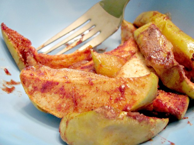 Preheat oven to 350. Slice apples into medium thick slices (like shown in the picture). Toss with honey and spices in a medium bowl. Place on an ungreased cookie sheet and baked for about 25 minutes, or until apples are tender but not mushy (like they’re about to fall apart). Serves 3!