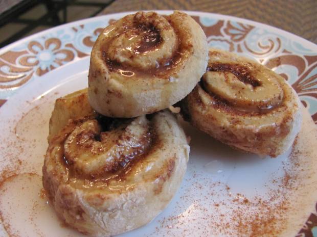 Preheat oven to 410. Make the “buttermilk” first and set aside. Mix all dry ingredients together (except the additional 1 cup of flour). Add buttermilk and melted Smart Balance, and stir. Gradually add the additional cup of flour until you can gently knead it with your hands. It will not be a stiff dough, but rather flexible. Half the ball of dough and dust countertop well with additonal flour to keep it from sticking. I tried to roll the dough out with a rolling pin, but that didn’t work hardly as well as flattening it out and shaping it into a long rectangle with my hands. Once it’s flattened out into a rectangle, mix up the filling ingredients in a bowl and spoon 3-4 tbsp of the mixture onto the dough, then roll it up, cut into slices (about 1 inch thick) and place on a cookie sheet generously sprayed with non-stick spray. Repeat the process for the remaining ball of dough. Bake for about 15 minutes or until the dough is done. Mix the glaxe ingredients together in yet another bowl and spoon over cinnamon buns when fresh out of the oven. Makes about 20 cinnamon rolls. Best when served hot and with lots of glaze!