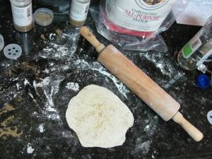 ingredients together in a medium mixing bowl with a spoon. Once it all starts to clump together, start using your hands to knead it. Add flour as necessary to keep it from being more wet than doughy. Divide into 6 balls. Lightly dust your countertop with flour and lightly rub your rolling pin with it as well. Flatten each ball out with the palms of your hands (add a light dusting of flour to you hands as needed to keep it from sticking to you), then roll out the ball into “tortilla-like” shapes. Rub on cumin and coriander if you wish. Place each roti on the skillet and flip as it starts to harden (about 4-5 minutes on each side). They will get browned spots on them when they are done and will look like a stiff tortilla. Makes 6 rotis.