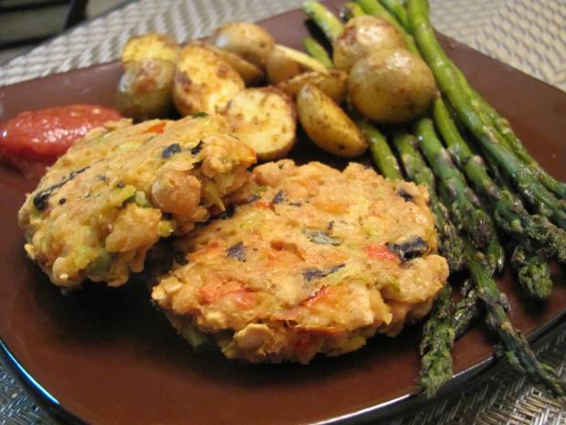 Begin by heating the oven to 370. Open chickpeas and strain all liquid from the can. Make sure there is NO liquid because you don’t want runny crab cakes that won’t stick together. In a medium mixing bowl, smash chickpeas with a potato masher. I smashed mine as much as I could with the potato masher, then switched over to a regular spoon to flatten them out completely. Make sure there are no whole chickpeas left. Chop green pepper, red pepper and celery into manageable pieces and chop finely in a food processor. Add to bowl with smashed chickpeas. With the kitchen scissors, snip up the sheet of sushi nori seaweed into fine pieces. I found it almost impossible to cut with a knife the way I wanted, plus I am really impatient, so I used the kitchen scissors because they were faster and I could get smaller pieces. Add chopped sushi nori to the bowl along with the rest of the ingredients except the saltines. Crush the saltines a few at a time over the bowl into very fine crumbles (no big cracker chunks), then mix everything very well. On a cookie sheet sprayed very generously with nonstick spray, place balls of the chickpea mixture and flatten with your palms to about 1/2 inch to 1 inch thick. Bake for 10 minutes on each side (total 20 minutes bake time). Makes 9-10 crabless crab cakes! Excellent served with cocktail sauce and a squeeze of lemon or with tartar sauce – OR just by themselves! Imagine these on a burger bun – holy crab cake sandwich nirvana, batman!