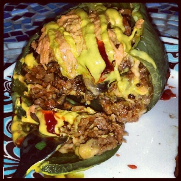 Preheat oven to 425. Slice shallots and mushrooms and set aside. Heat oil in a medium skillet on medium/high heat and add onions and garlic. Sautee until the “raw” garlic smell goes away. Add the log of Gimme Lean veggie meat and cut it into smaller chunks with the spatula. Then, smash with a fork until it’s chopped into small pieces. Season with paprika and pepper now if you wish. Add mushrooms and sautee about 10 minutes or until veggie meat starts to brown. If you feel like the meat is drying out while you are browning it, don’t add more oil; add a few tablespoons of water at a time to keep it moist. Remove from heat and let cool for 10 minutes. Cut tops off bell peppers and gently remove the core with a knife and/or spoon. Sprinkle a layer of the Daiya cheese on the bottom of the pepper, followed by a layer of the veggie meat mixture. Repeat layers, gently pressing them down firm so as to pack it into the pepper tightly until you reach the top. Cover with a generous amount of Daiya cheddar shreds and roast for about 25 minutes on the rack in the middle or bottom third of the oven until the peppers are soft, but not so soft they fall apart. You want them to be soft, but just crisp enough to still hold all that cheezestake goodness inside. Serve with a side salad or sweet potato fries. Makes 2 large stuffed bell peppers.