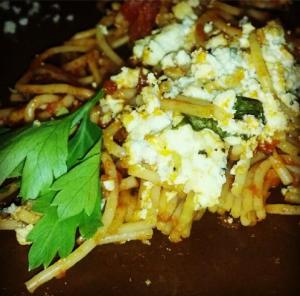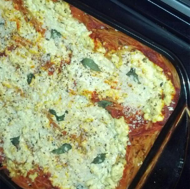 Ever have those days where you’re just sitting at work and you are struck with a sudden craving for a particular food and you can’t let go of that hankering until you have it? I was dreaming about baked spaghetti with cheese on it today, so that’s what I went home and made for dinner! This vegan ricotta cheese is so fast to make and it tastes good. I had to stop myself from eating all of it by itself before even putting any on the spaghetti. Simple ingredients, simple comfort food – just what I needed today!