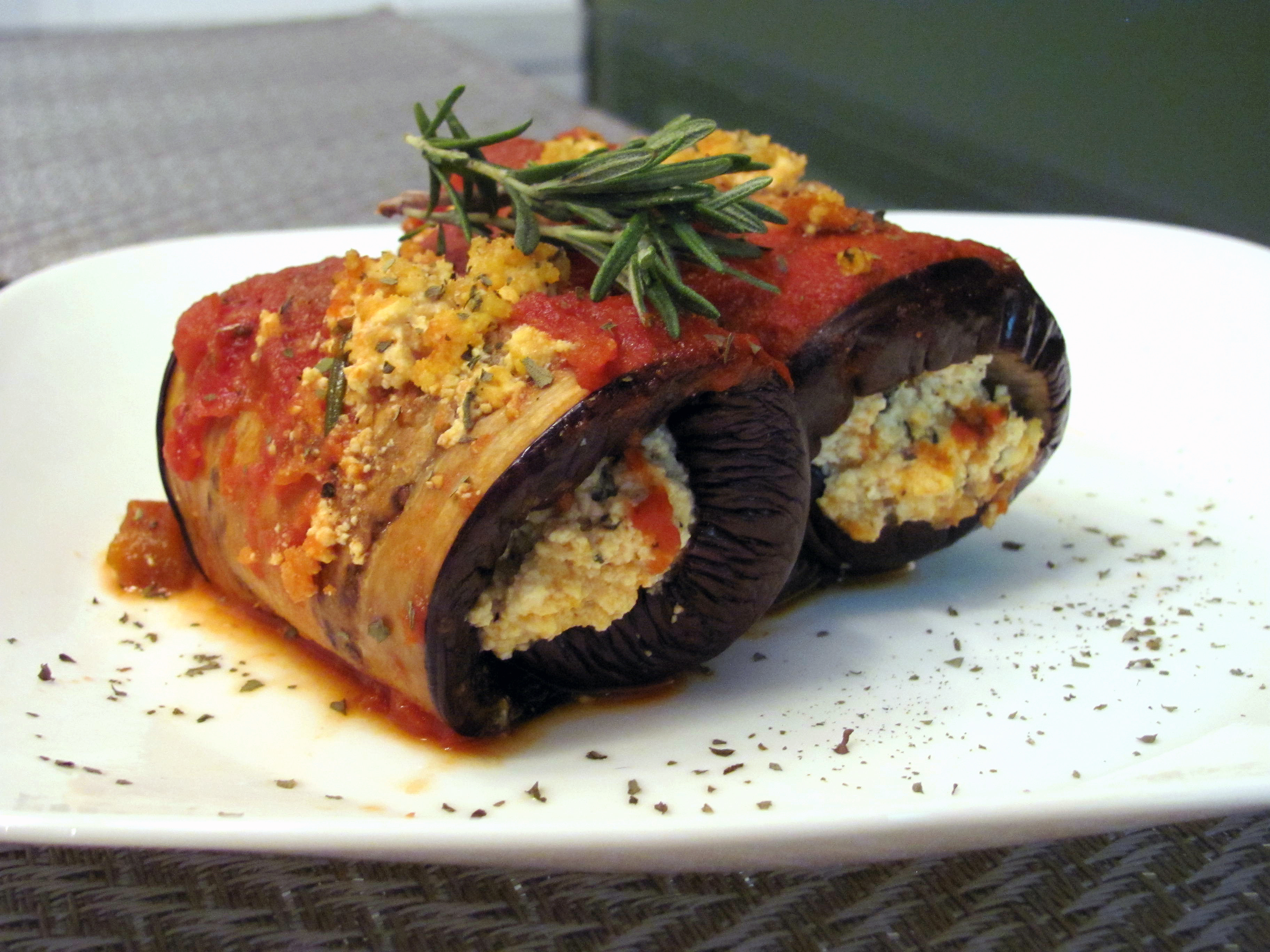 Preheat oven to 375°. Cut tops off eggplants and slice vertically (from where the stem was to the bottom) 1/2 inch thick. Generously spray baking sheets with nonstick spray. Sprinkle eggplant slices lightly with salt and arrange on the baking sheets. Bake on the top rack for no more than 10 minutes. Doing this will soften them but not actually cook them enough so they become creamy and won’t hold together. They will usually start to steam in the oven. Tonight there was steam coming out the top of my oven. I may or may not have had a mini panic attack, but it was in vain. They were fine. Remove eggplant spices from oven and carefully move them onto a large platter to cool about 5 minutes, or longer until you can touch them without them being too hot. Spray a glass baking dish with nonstick spray and about 1/2 cup marinara or pasta sauce. Spread the pasta sauce around so it covers the bottom of the baking dish. Place about 2 tablespoons of the tofu ricotta on the large end of the eggplant slice and gently roll it up, similar to rolling up a burrito. Place each one side by side into the baking dish, just like regular manicotti. Top with remaining pasta sauce and any remaining ricotta and spread evenly. Bake on middle rack for about 20 minutes, or until eggplants are fully cooked. Makes about 6-8- servings of 2 manicottis each.