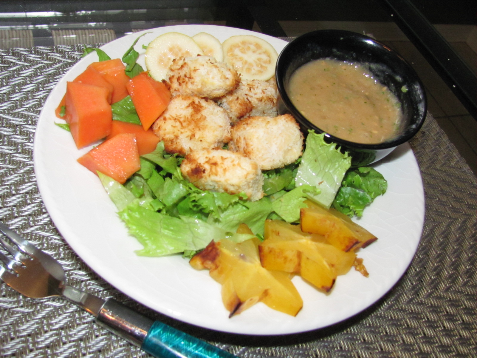 Serve over greens of your choice and additional fresh fruit. Here I used up the rest of my papaya, some guava slices and starfruit.