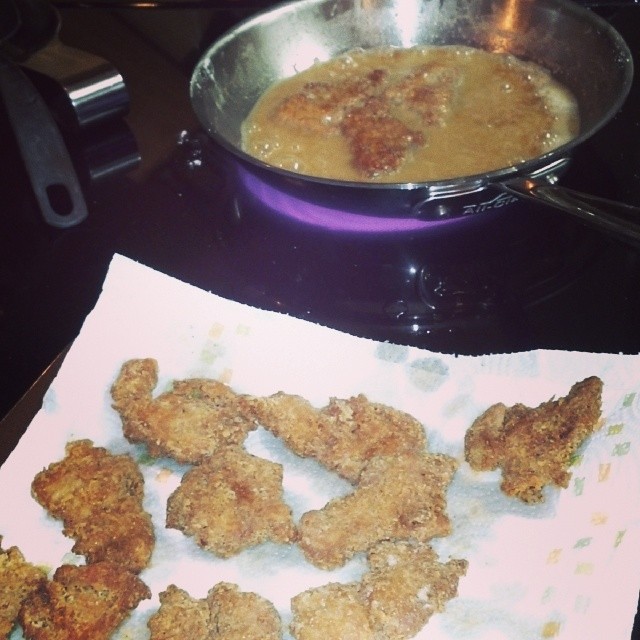 I rehydrated them in vegetable broth as per the box, but I seasoned it with some garlic and onion powders, poultry seasoning and a decent sprinkling of smoked paprika. Once they were rehydrated (takes about 5 minutes for them to soak up enough liquid to be “meaty” again). I heated oil in a skillet, tossed them in flour and fried until golden brown. I let them drain on a paper towel lined plate then tossed them in Franks Red Hot, smacked them on a wheat bun with some nutritionallly void (lol) iceberg lettuce and called it dinner.